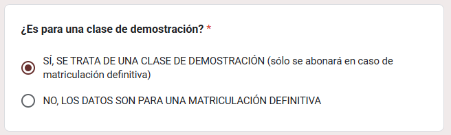 Para ello, sólo tienes que cumplimentar el formulario de matrícula indicando que solicitas una clase de demostración y seleccionando una de las clases disponibles.